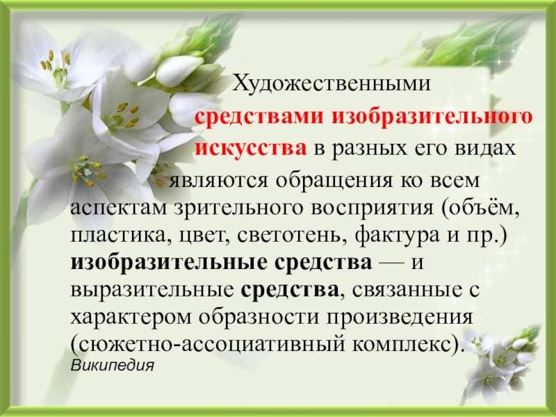 являются обращения ко всем аспектам зрительного восприятия (объём, пластика, цвет, светотень, фактура и пр.) изобразительные средства — и выразительные средства, связанные с характером образности произведения (сюжетно-ассоциативный комплекс). Википедия