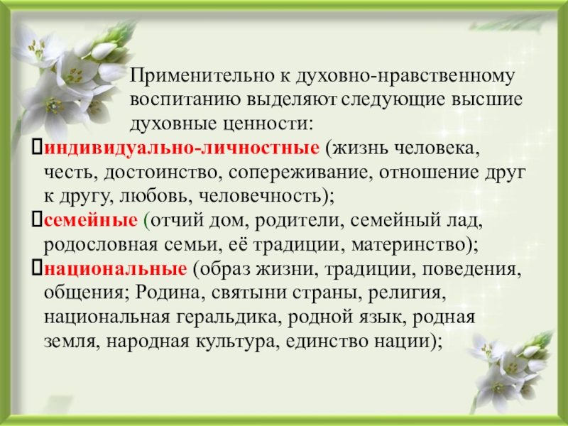 национальные (образ жизни, традиции, поведения, общения; Родина, святыни страны, религия, национальная геральдика, родной язык, родная земля, народная культура, единство нации);