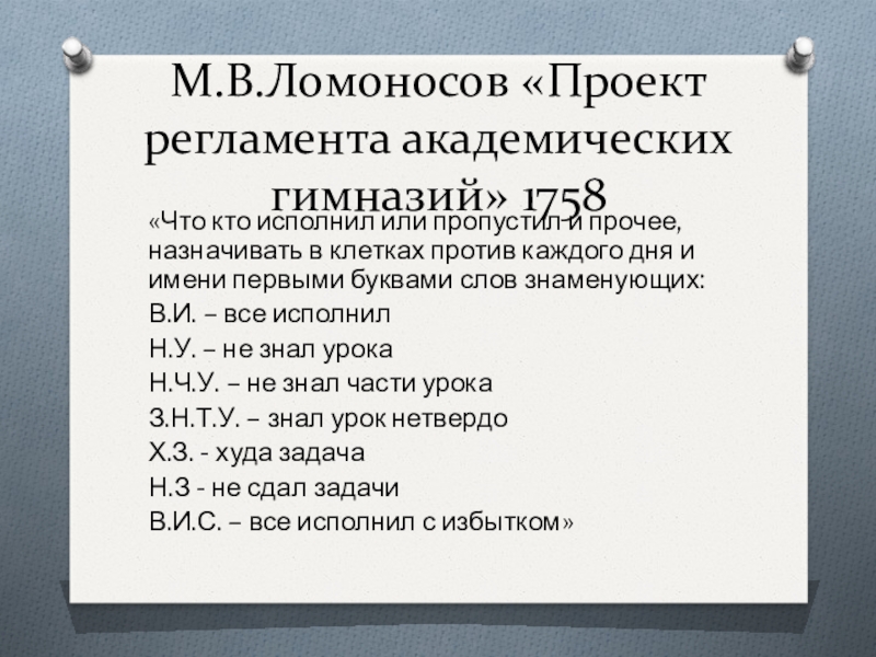 Слайд 14М.В.Ломоносов «Проект регламента академических гимназий» 1758