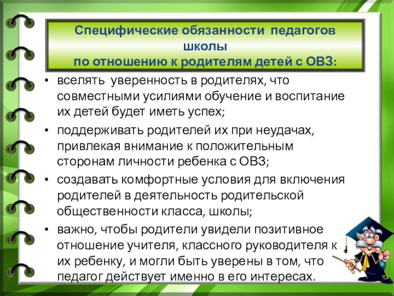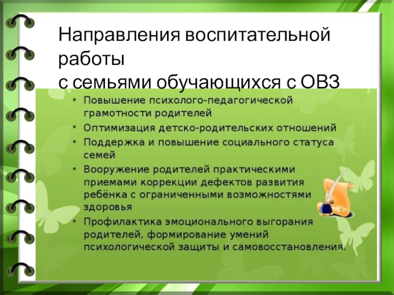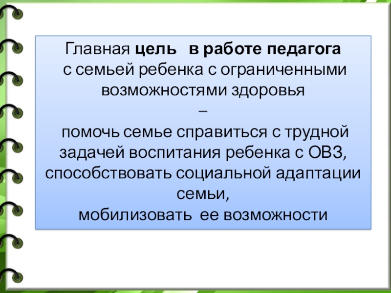 помочь семье справиться с трудной задачей воспитания ребенка с ОВЗ, способствовать социальной адаптации семьи,