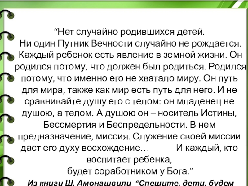 Каждый ребенок есть явление в земной жизни. Он родился потому, что должен был родиться. Родился потому, что именно его не хватало миру. Он путь для мира, также как мир есть путь для него. И не сравнивайте душу его с телом: он младенец не душою, а телом. А душою он – носитель Истины, Бессмертия и Беспредельности. В нем предназначение, миссия. Служение своей миссии даст его духу восхождение… И каждый, кто воспитает ребенка,