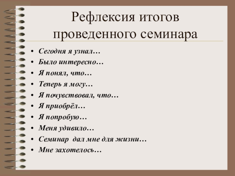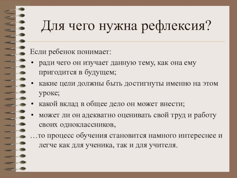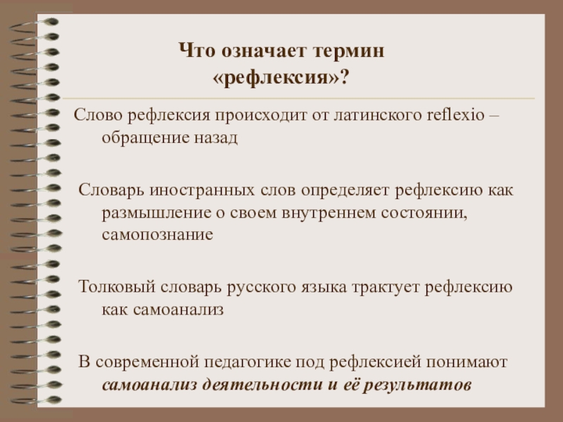 В современной педагогике под рефлексией понимают самоанализ деятельности и её результатов