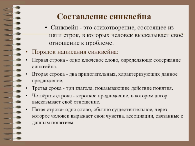 Пятая строка- одно слово, обычно существительное, через которое человек выражает свои чувства, ассоциации, связанные с данным понятием.
