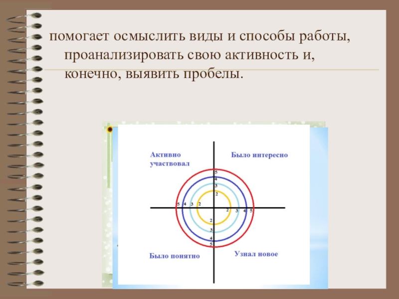 Слайд 13помогает осмыслить виды и способы работы, проанализировать свою активность и, конечно,