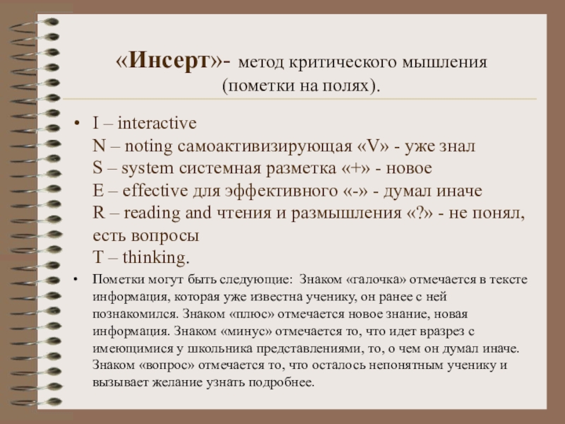 Пометки могут быть следующие: Знаком «галочка» отмечается в тексте информация, которая уже известна ученику, он ранее с ней познакомился. Знаком «плюс» отмечается новое знание, новая информация. Знаком «минус» отмечается то, что идет вразрез с имеющимися у школьника представлениями, то, о чем он думал иначе. Знаком «вопрос» отмечается то, что осталось непонятным ученику и вызывает желание узнать подробнее.