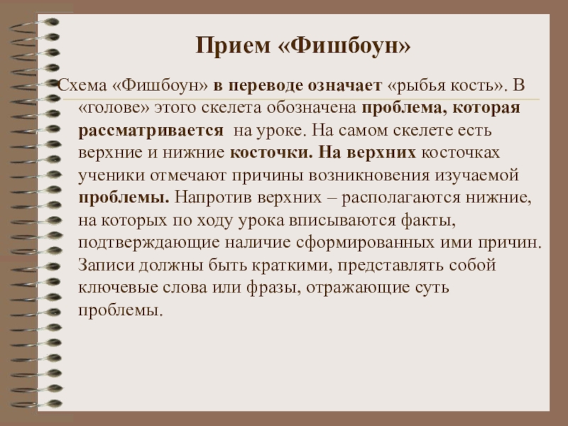 этого скелета обозначена проблема, которая рассматривается на уроке. На самом скелете есть верхние и нижние косточки. На верхних косточках ученики отмечают причины возникновения изучаемой проблемы. Напротив верхних – располагаются нижние, на которых по ходу урока вписываются факты, подтверждающие наличие сформированных ими причин. Записи должны быть краткими, представлять собой ключевые слова или фразы, отражающие суть проблемы.