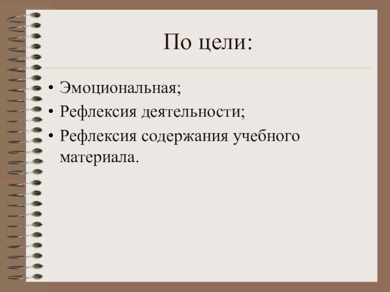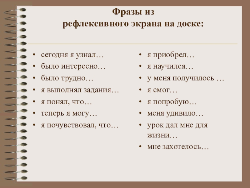 это принято считать, но и на любом его этапе, по итогам изучения темы, целого раздела материала.. Рефлексия направлена на осознание пройденного пути, на сбор в общую копилку замеченного, обдуманного, понятого каждым. Её цель не просто уйти с урока с зафиксированным результатом, а выстроить смысловую цепочку, сравнить способы и методы, применяемые другими участниками деятельности со своими.