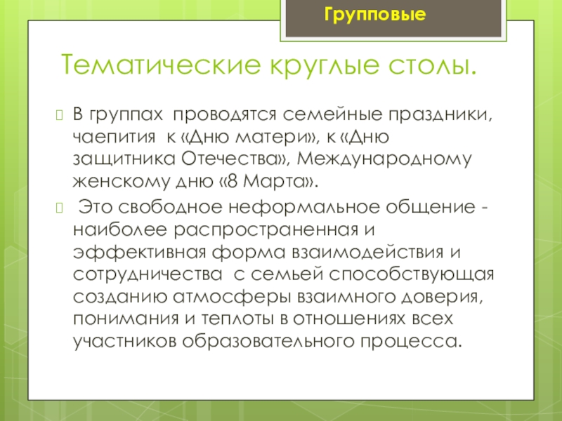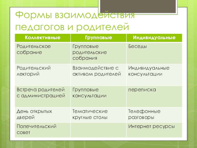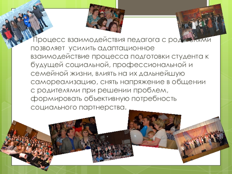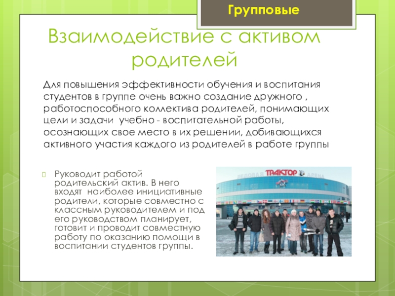 Для повышения эффективности обучения и воспитания студентов в группе очень важно создание дружного , работоспособного коллектива родителей, понимающих цели и задачи учебно - воспитательной работы, осознающих свое место в их решении, добивающихся активного участия каждого из родителей в работе группы