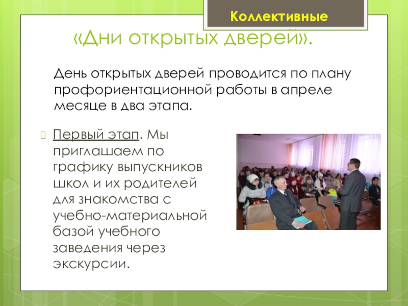 День открытых дверей проводится по плану профориентационной работы в апреле месяце в два этапа.