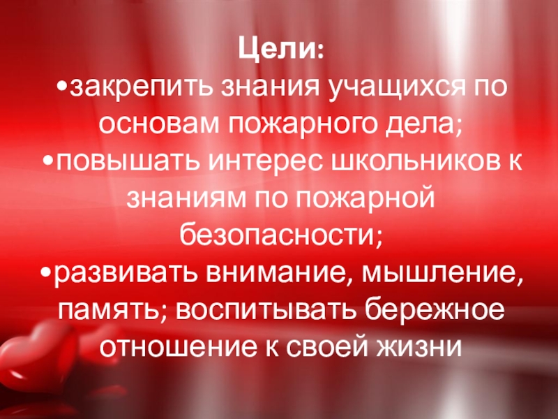 Цели:•закрепить знания учащихся по основам пожарного дела;•повышать интерес школьников к знаниям по пожарной безопасности;•развивать внимание, мышление, память;