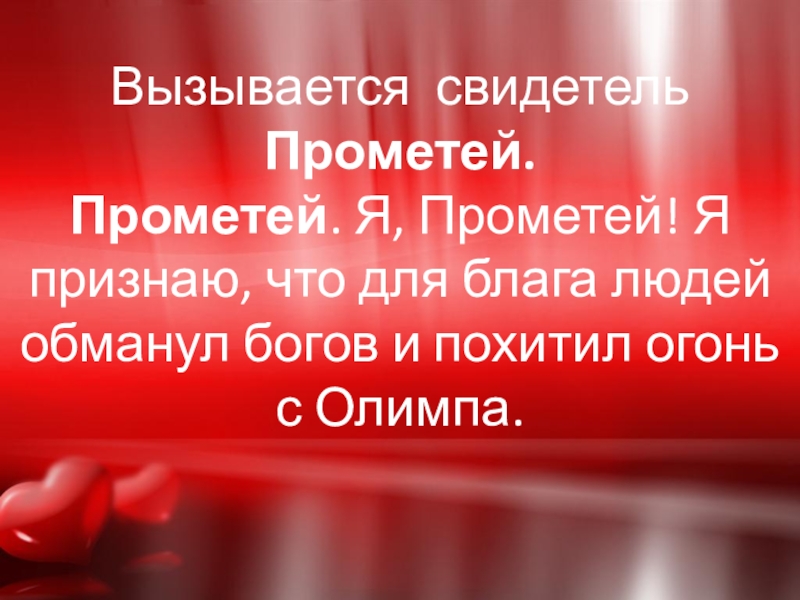 Слайд 17Вызывается  свидетель Прометей. Прометей. Я, Прометей! Я признаю, что для блага людей