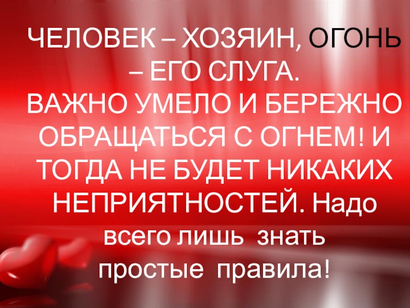ЧЕЛОВЕК – ХОЗЯИН, ОГОНЬ – ЕГО СЛУГА.ВАЖНО УМЕЛО И БЕРЕЖНО ОБРАЩАТЬСЯ С ОГНЕМ! И ТОГДА НЕ БУДЕТ