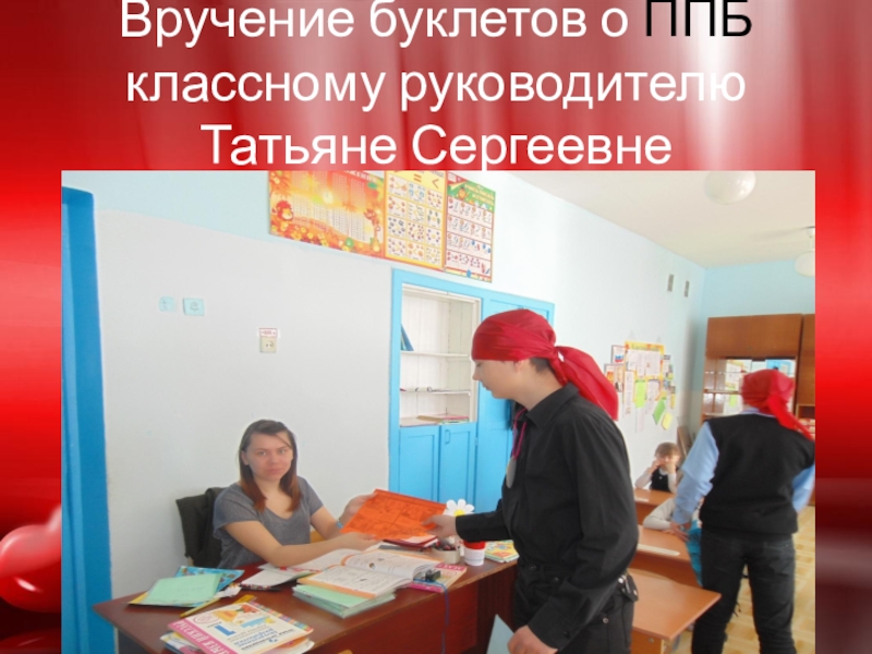 Слайд 7Вручение буклетов о ППБ классному руководителю Татьяне Сергеевне