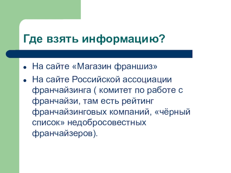 комитет по работе с франчайзи, там есть рейтинг франчайзинговых компаний, «чёрный список» недобросовестных франчайзеров).