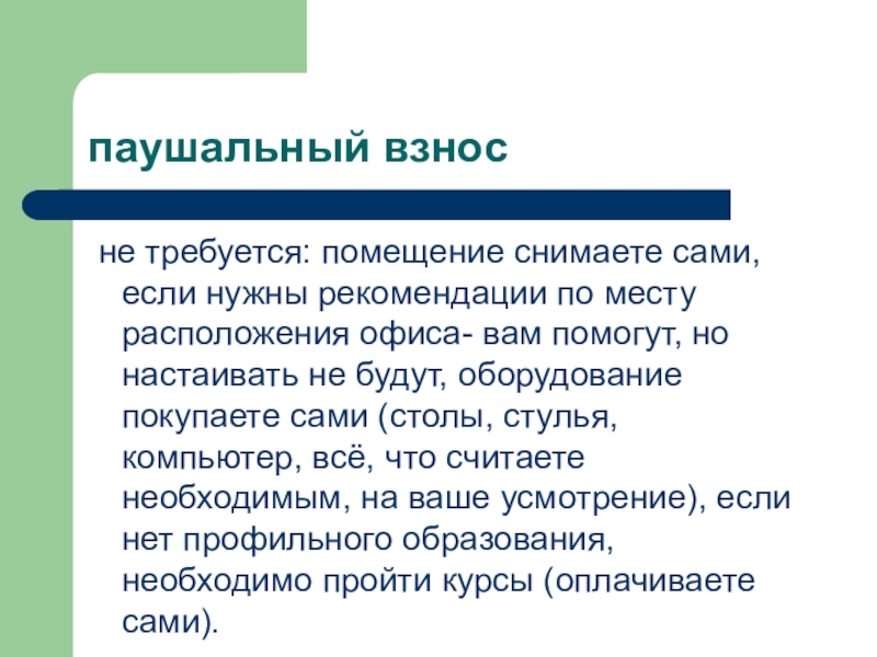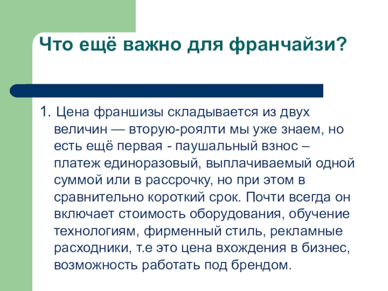 — вторую-роялти мы уже знаем, но есть ещё первая - паушальный взнос – платеж единоразовый, выплачиваемый одной суммой или в рассрочку, но при этом в сравнительно короткий срок. Почти всегда он включает стоимость оборудования, обучение технологиям, фирменный стиль, рекламные расходники, т.е это цена вхождения в бизнес, возможность работать под брендом.