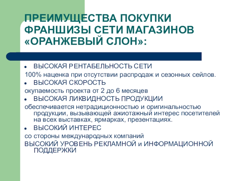 Слайд 25ПРЕИМУЩЕСТВА ПОКУПКИ ФРАНШИЗЫ СЕТИ МАГАЗИНОВ «ОРАНЖЕВЫЙ СЛОН»: