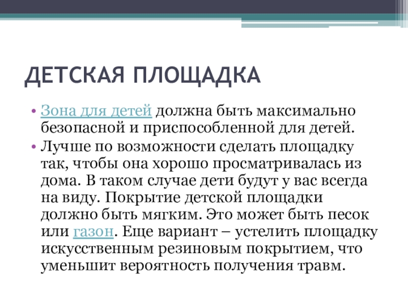 ДЕТСКАЯ ПЛОЩАДКАЗона для детей должна быть максимально безопасной и приспособленной для детей.Лучше по возможности сделать площадку так, чтобы