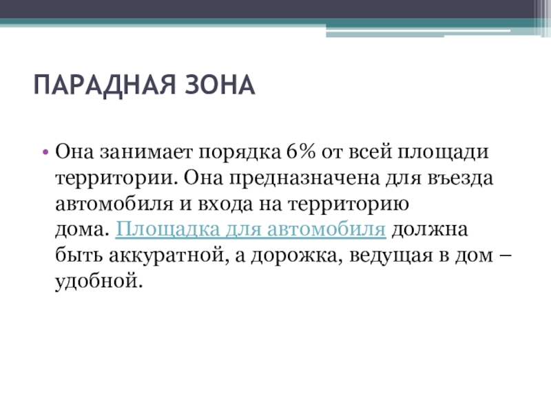 ПАРАДНАЯ ЗОНА Она занимает порядка 6% от всей площади территории. Она предназначена для въезда автомобиля и входа