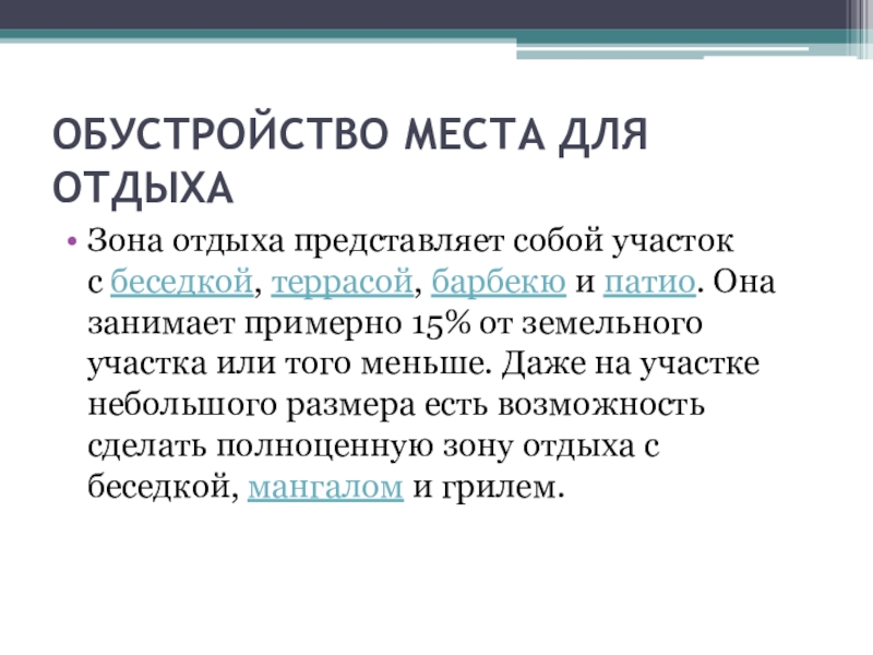 ОБУСТРОЙСТВО МЕСТА ДЛЯ ОТДЫХАЗона отдыха представляет собой участок с беседкой, террасой, барбекю и патио. Она занимает примерно 15% от земельного участка или