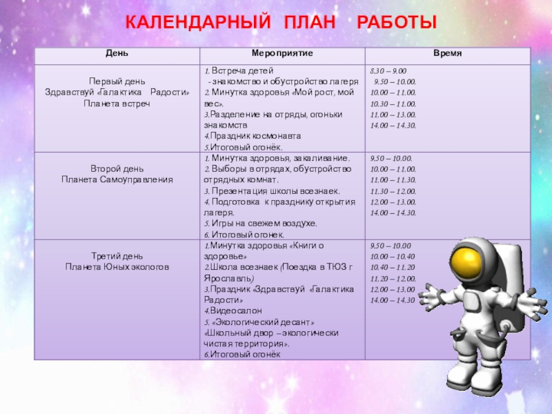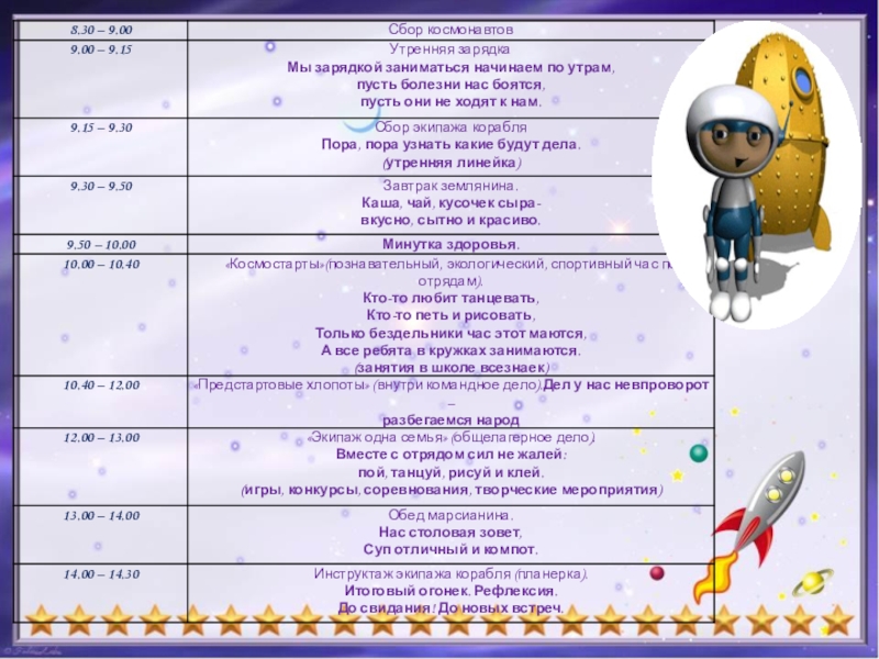 Дети находились в оздоровительном лагере с 8 .30 до 14.30 с 2-х разовым питанием .
