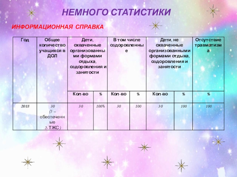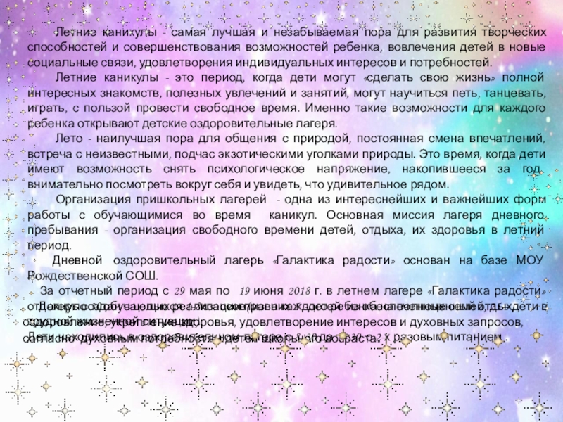 За отчетный период с 29 мая по 19 июня 2018 г. в летнем лагере «Галактика радости» отдохнуло 30 обучающихся 1-8классов( из них 5 -детей из обеспеченных семей, 25 – дети в трудной жизненной ситуации).