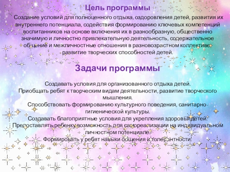 Лагерь создан с целью реализации права каждого ребенка на полноценный отдых, оздоровление, укрепление здоровья, удовлетворение интересов и духовных запросов, согласно духовным потребностям детей школьного возраста.