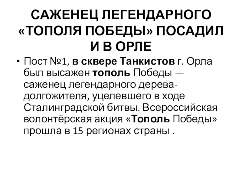 Саженец легендарного «Тополя Победы» посадили в ОрлеПост №1, в сквере Танкистов г. Орла был высажен тополь Победы — саженец легендарного дерева-долгожителя, уцелевшего в ходе Сталинградской битвы. Всероссийская волонтёрская акция «Тополь Победы» прошла в 15 регионах страны .