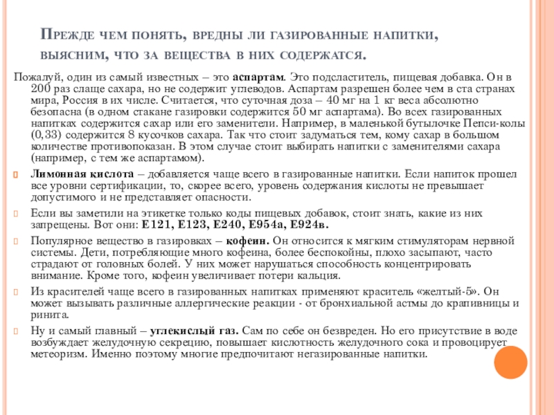 Лимонная кислота – добавляется чаще всего в газированные напитки. Если напиток прошел все уровни сертификации, то, скорее всего, уровень содержания кислоты не превышает допустимого и не представляет опасности.