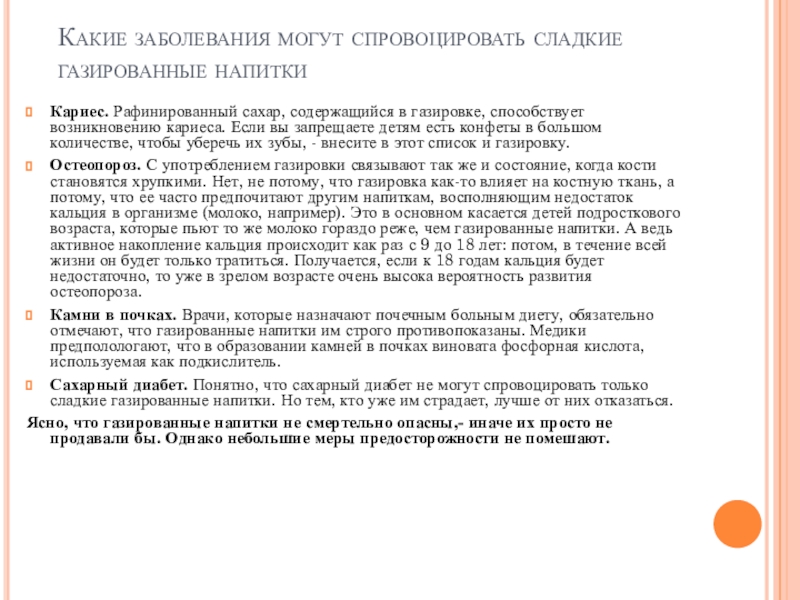 Популярное вещество в газировках – кофеин. Он относится к мягким стимуляторам нервной системы. Дети, потребляющие много кофеина, более беспокойны, плохо засыпают, часто страдают от головных болей. У них может нарушаться способность концентрировать внимание. Кроме того, кофеин увеличивает потери кальция.
