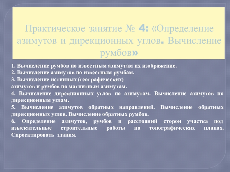 Слайд 17Практическое занятие № 4: «Определение азимутов и дирекционных углов. Вычисление румбов»