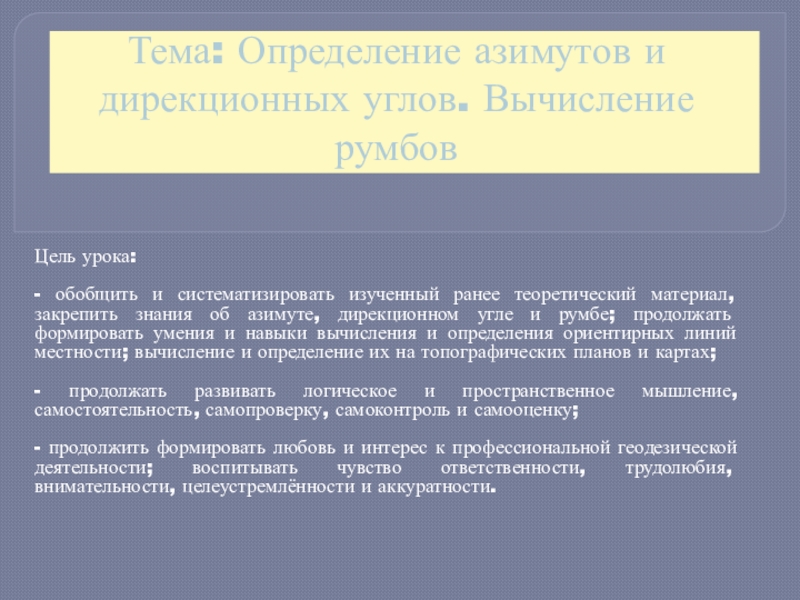 систематизировать изученный ранее теоретический материал, закрепить знания об азимуте, дирекционном угле и румбе; продолжать формировать умения и навыки вычисления и определения ориентирных линий местности; вычисление и определение их на топографических планов и картах;