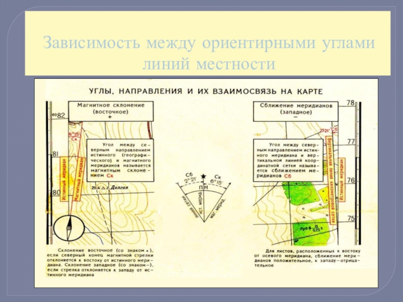 Слайд 10Зависимость между дирекционным углом, истинным и магнитным азимутами линий