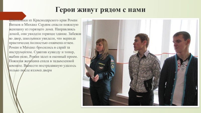 Михаил Сердюк спасли пожилую женщину из горящего дома. Направляясь домой, они увидели горящее здание. Забежав во двор, школьники увидели, что веранда практически полностью охвачена огнем. Роман и Михаил бросились в сарай за инструментом. Схватив кувалду и топор, выбив окно, Роман залез в оконный проем. Пожилая женщина спала в задымленной комнате. Вынести пострадавшую удалось только после взлома двери
