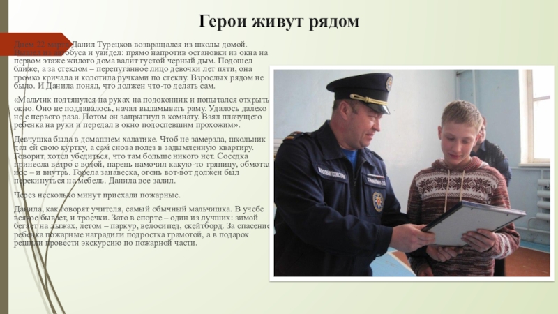 Данила, как говорят учителя, самый обычный мальчишка. В учебе всякое бывает, и троечки. Зато в спорте – один из лучших: зимой бегает на лыжах, летом – паркур, велосипед, скейтборд. За спасение ребенка пожарные наградили подростка грамотой, а в подарок решили провести экскурсию по пожарной части.