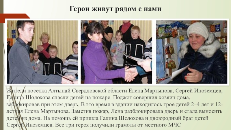 Сергей Иноземцев, Галина Шолохова спасли детей на пожаре. Поджог совершил хозяин дома, заблокировав при этом дверь. В это время в здании находилось трое детей 2–4 лет и 12-летняя Елена Мартынова. Заметив пожар, Лена разблокировала дверь и стала выносить детей из дома. На помощь ей пришла Галина Шолохова и двоюродный брат детей Сергей Иноземцев. Все три героя получили грамоты от местного МЧС
