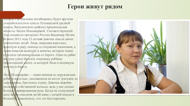Лида Пономарёва — единственная из окружающих ребят и взрослых, оказавшихся на месте трагедии, не задумываясь, бросилась в реку. Девочка вдвойне рисковала собственной жизнью, ведь у нее сильно болела травмированная рука. Когда на следующий день после спасения детей мама с дочкой пошли в больницу, выяснилось, что это был перелом.