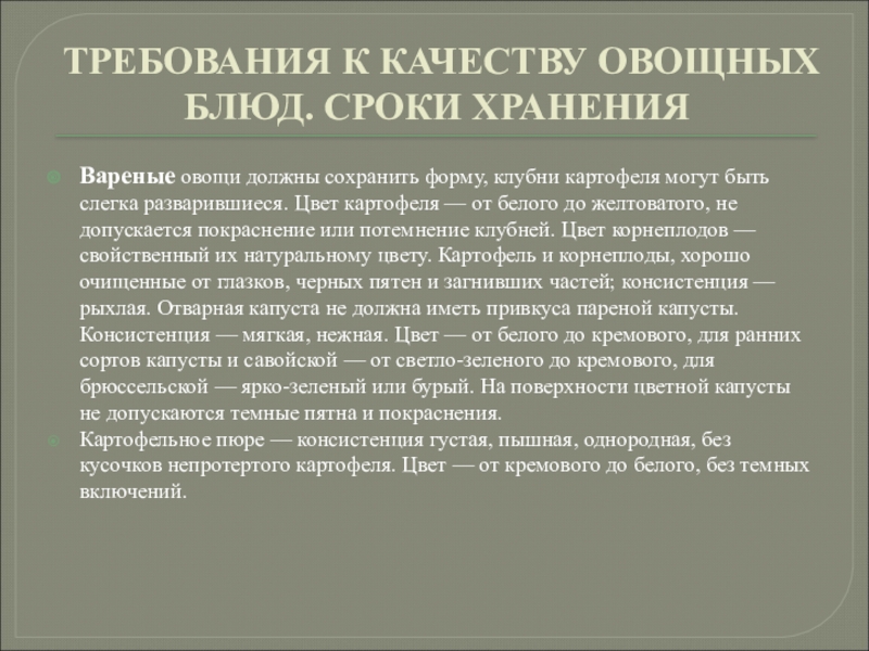 Слайд 9ТРЕБОВАНИЯ К КАЧЕСТВУ ОВОЩНЫХ БЛЮД. СРОКИ ХРАНЕНИЯ