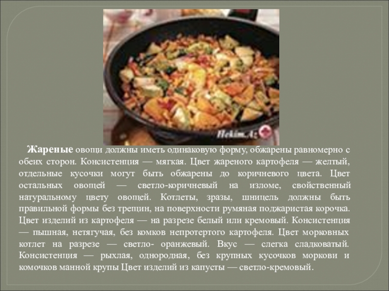 Консистенция — мягкая. Цвет жареного картофеля — желтый, отдельные кусочки могут быть обжарены до коричневого цвета. Цвет остальных овощей — светло-коричневый на изломе, свойственный натуральному цвету овощей. Котлеты, зразы, шницель должны быть правильной формы без трещин, на поверхности румяная поджаристая корочка. Цвет изделий из картофеля — на разрезе белый или кремовый. Консистенция — пышная, нетягучая, без комков непротертого картофеля. Цвет морковных котлет на разрезе — светло- оранжевый. Вкус — слегка сладковатый. Консистенция — рыхлая, однородная, без крупных кусочков моркови и комочков манной крупы Цвет изделий из капусты — светло-кремовый.