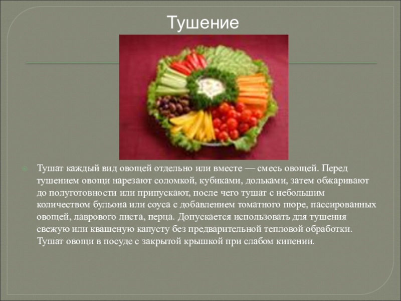 Слайд 7Тушат каждый вид овощей отдельно или вместе — смесь овощей. Перед