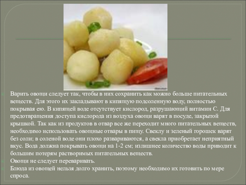 Слайд 4Варить овощи следует так, чтобы в них сохранить как можно больше
