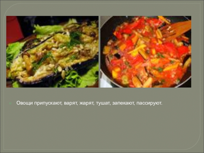 Слайд 3Овощи припускают, варят, жарят, тушат, запекают, пассируют.