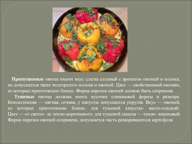 Слайд 10Припущенные овощи имеют вкус слегка соленый с ароматом овощей и молока,