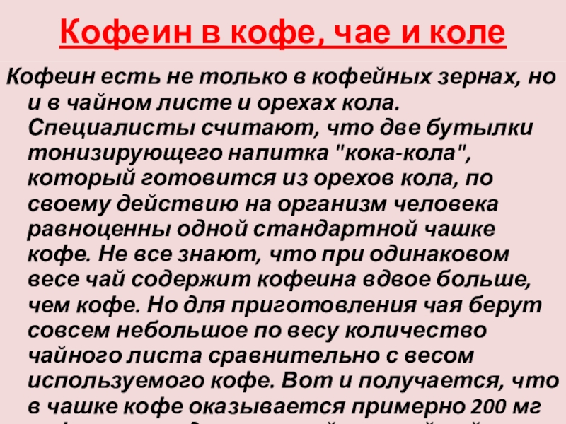 зернах, но и в чайном листе и орехах кола. Специалисты считают, что две бутылки тонизирующего напитка "кока-кола", который готовится из орехов кола, по своему действию на организм человека равноценны одной стандартной чашке кофе. Не все знают, что при одинаковом весе чай содержит кофеина вдвое больше, чем кофе. Но для приготовления чая берут совсем небольшое по весу количество чайного листа сравнительно с весом используемого кофе. Вот и получается, что в чашке кофе оказывается примерно 200 мг кофеина, тогда как самый крепкий чай содержит всего 100 мг.