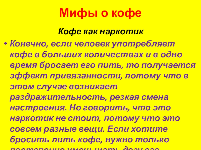 количествах и в одно время бросает его пить, то получается эффект привязанности, потому что в этом случае возникает раздражительность, резкая смена настроения. Но говорить, что это наркотик не стоит, потому что это совсем разные вещи. Если хотите бросить пить кофе, нужно только постепенно уменьшать дозу его употребления.