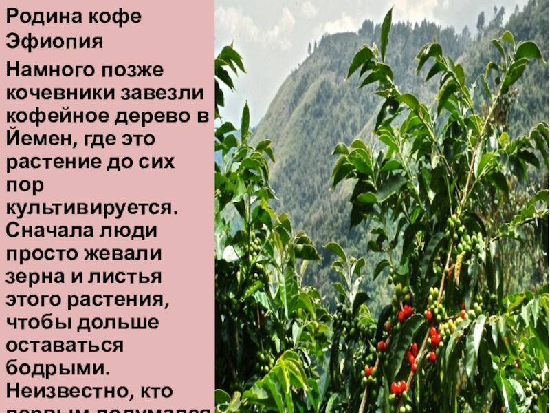 Намного позже кочевники завезли кофейное дерево в Йемен, где
