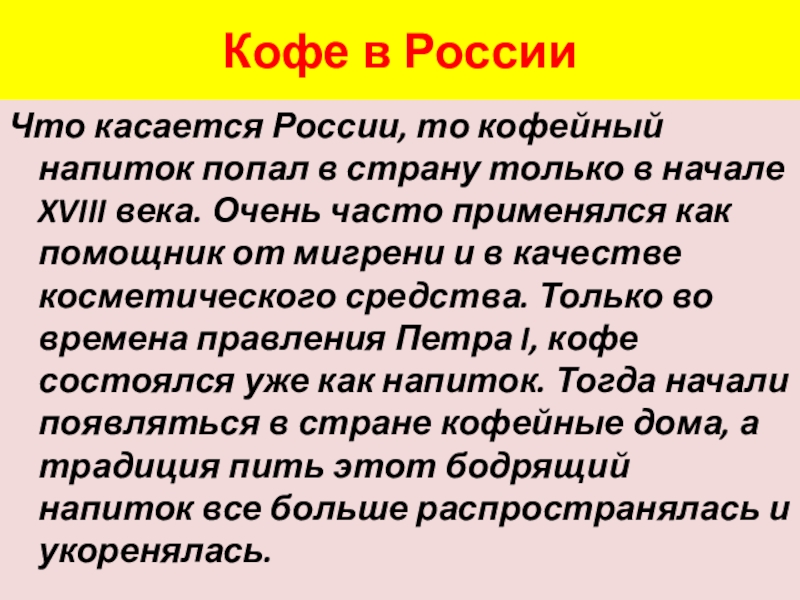 только в начале XVIII века. Очень часто применялся как помощник от мигрени и в качестве косметического средства. Только во времена правления Петра I, кофе состоялся уже как напиток. Тогда начали появляться в стране кофейные дома, а традиция пить этот бодрящий напиток все больше распространялась и укоренялась.
