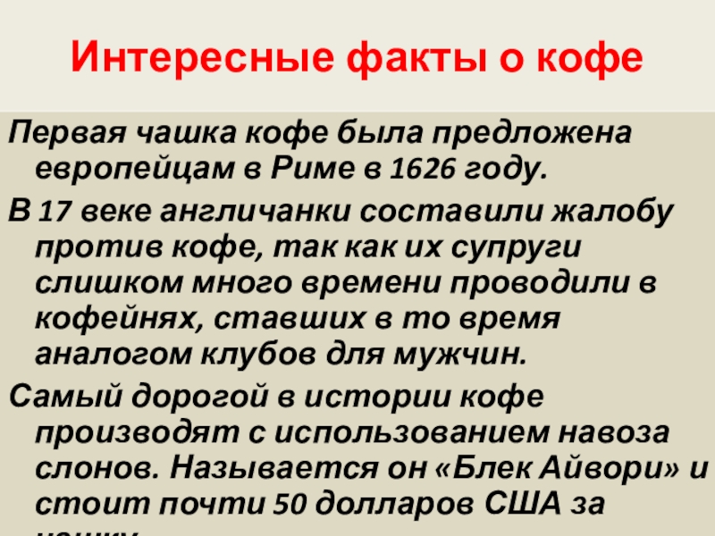 В 17 веке англичанки составили жалобу против кофе, так как их супруги слишком много времени проводили в кофейнях, ставших в то время аналогом клубов для мужчин.