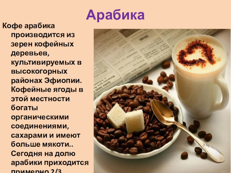 Эфиопии. Кофейные ягоды в этой местности богаты органическими соединениями, сахарами и имеют больше мякоти.. Сегодня на долю арабики приходится примерно 2/3 кофейного производства.