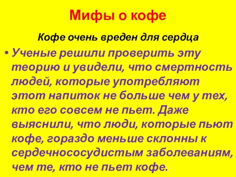 и увидели, что смертность людей, которые употребляют этот напиток не больше чем у тех, кто его совсем не пьет. Даже выяснили, что люди, которые пьют кофе, гораздо меньше склонны к сердечнососудистым заболеваниям, чем те, кто не пьет кофе.
