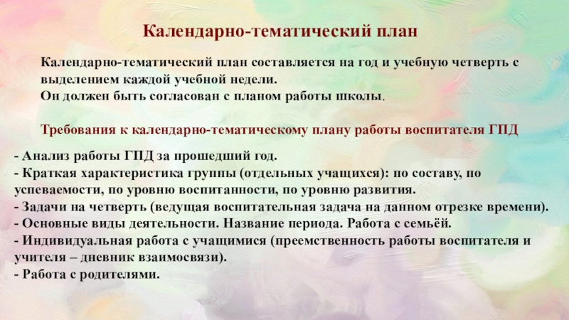 Требования к календарно-тематическому плану работы воспитателя ГПД
